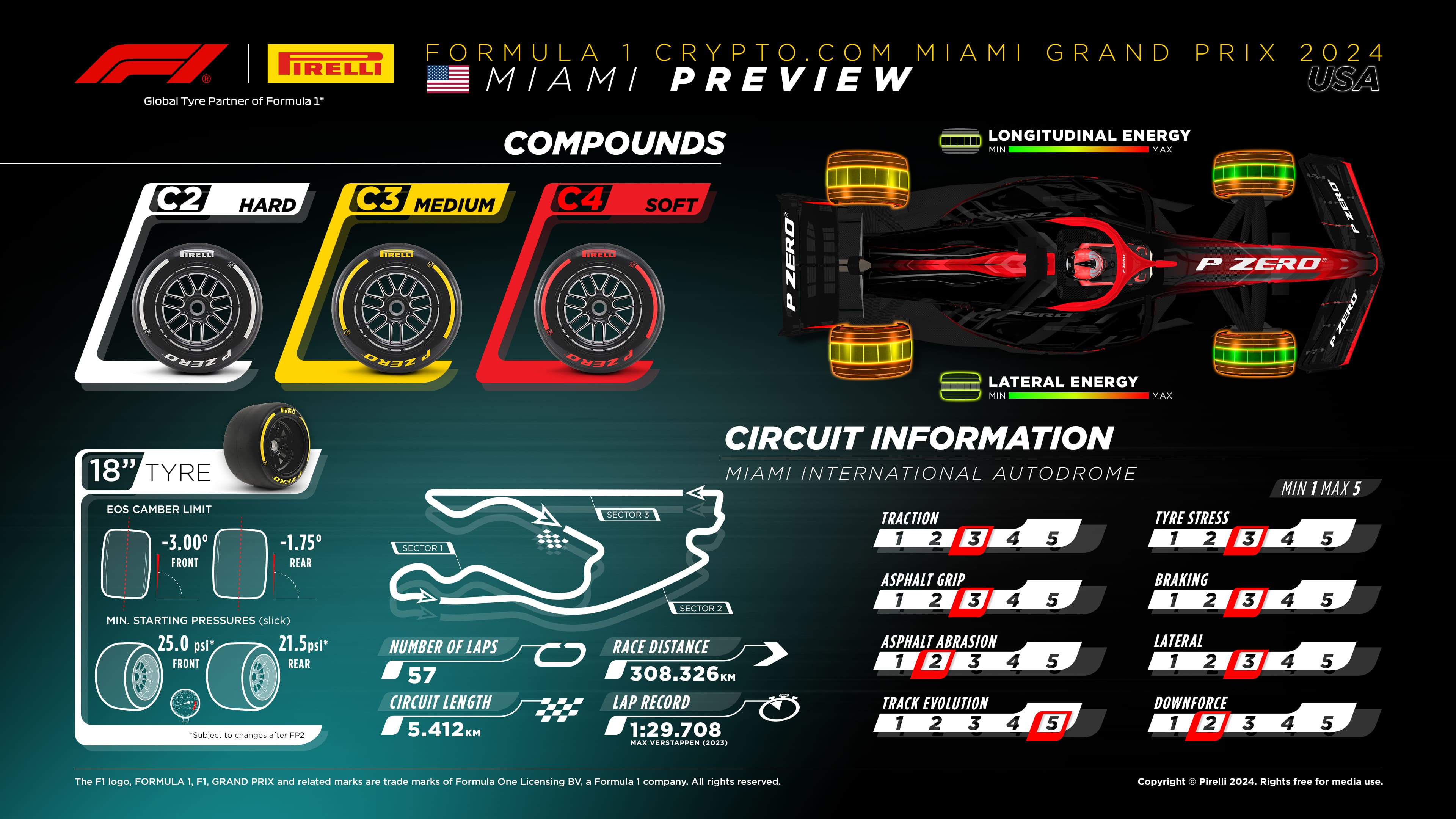 Em termos de estratégia, o GP de Miami é uma corrida de uma parada clássica, com os compostos Duro e Médio como favoritos. No ano passado, Verstappen largou da nona posição do grid com pneus Duros antes de trocar para Médios, enquanto os outros dois pilotos que chegaram ao pódio, Perez e Alonso, seguiram o caminho oposto (Médio e depois Duro).
