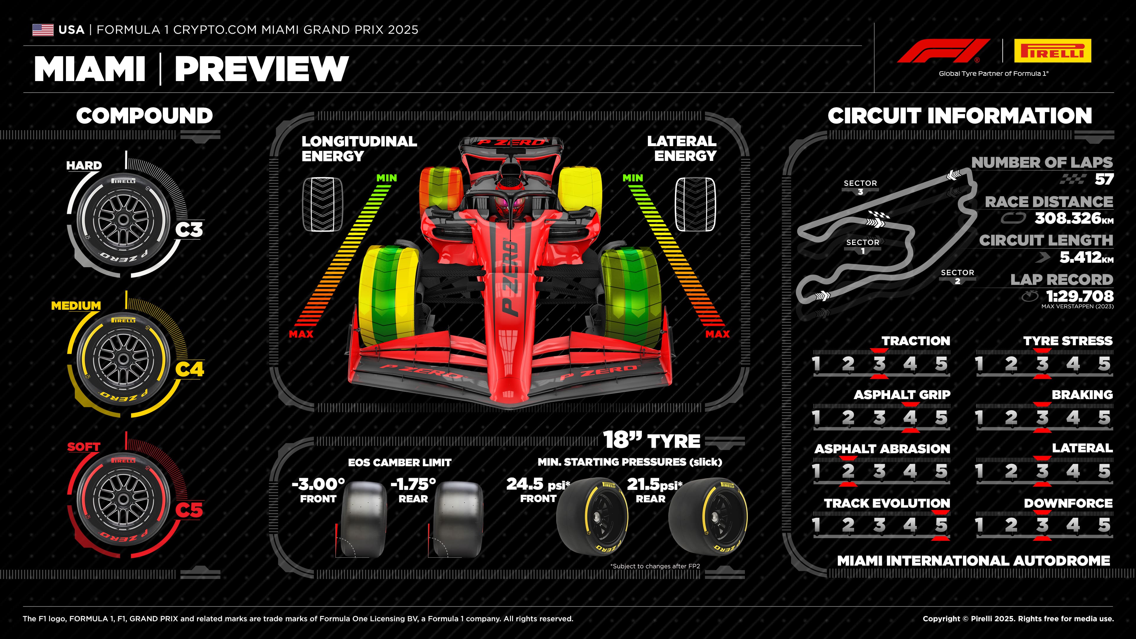 Até agora, o GP de Miami tem sido uma corrida com apenas um pit-stop, incluindo a do ano passado. O pneu Médio foi o preferido para o stint de abertura por 15 dos 20 pilotos, antes de uma mudança principalmente para o Duro, com apenas alguns pilotos optando pelo Macio, que apresentou degradação relativamente baixa. A diferença de performance entre os três compostos do ano passado, C2, C3 e C4, foi bem pequena. A estratégia, especialmente o momento do pit-stop, foi afetada por um Safety Car Virtual, que depois se transformou em um período completo de Safety Car. Será interessante ver se os compostos mais macios deste ano abrirão a porta para uma estratégia de duas paradas.