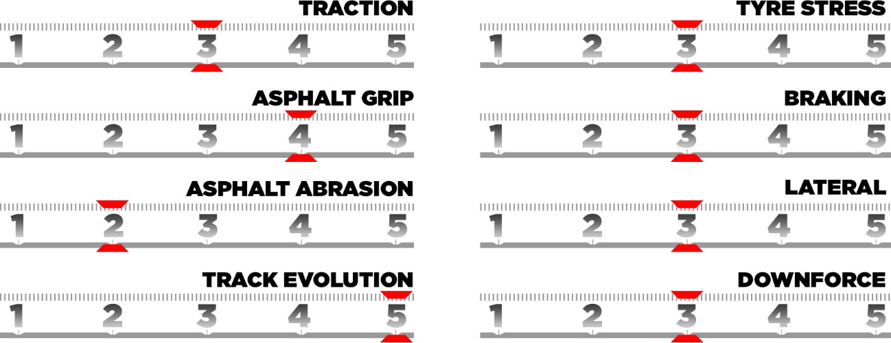 O trio de compostos escolhido pela Pirelli é o mesmo utilizado há duas semanas na Arábia Saudita: C3 como Duro, C4 como Médio e C5 como Macio. Mais uma vez, assim como em Jeddah, é um degrau mais macio do que na temporada passada.