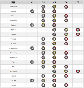 Apenas três cores em cada corrida em 2019, com cinco compostos diferentes disponíveis: C1 é o mais duro e C5 é o mais macio.