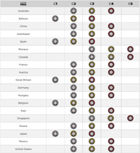 Apenas três cores em cada corrida em 2019, com cinco compostos diferentes disponíveis: C1 é o mais duro e C5 é o mais macio.