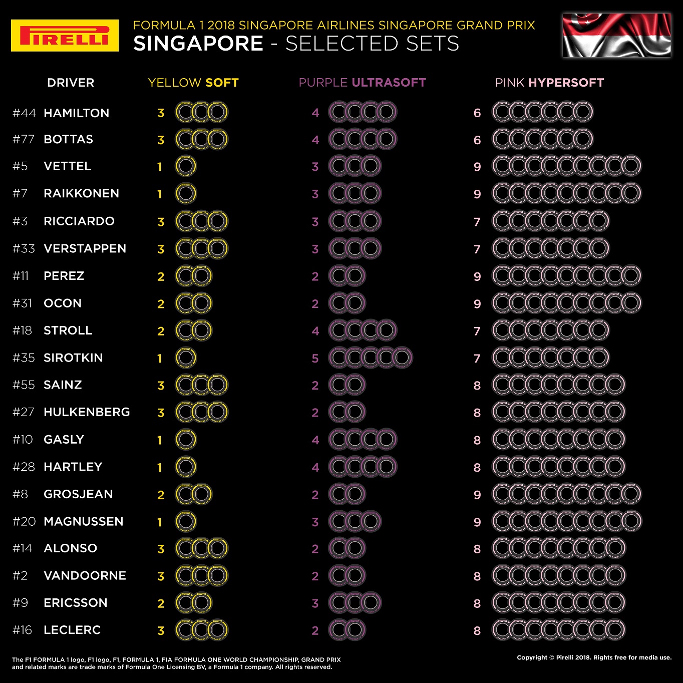 Milão, 4 de setembro de 2018 – A Federação Internacional de Automobilismo (FIA) informou à Pirelli as escolhas de pneus de cada equipe para o Grande Prêmio de Singapura, que será realizado entre os dias 14 e 16 de setembro de 2018.