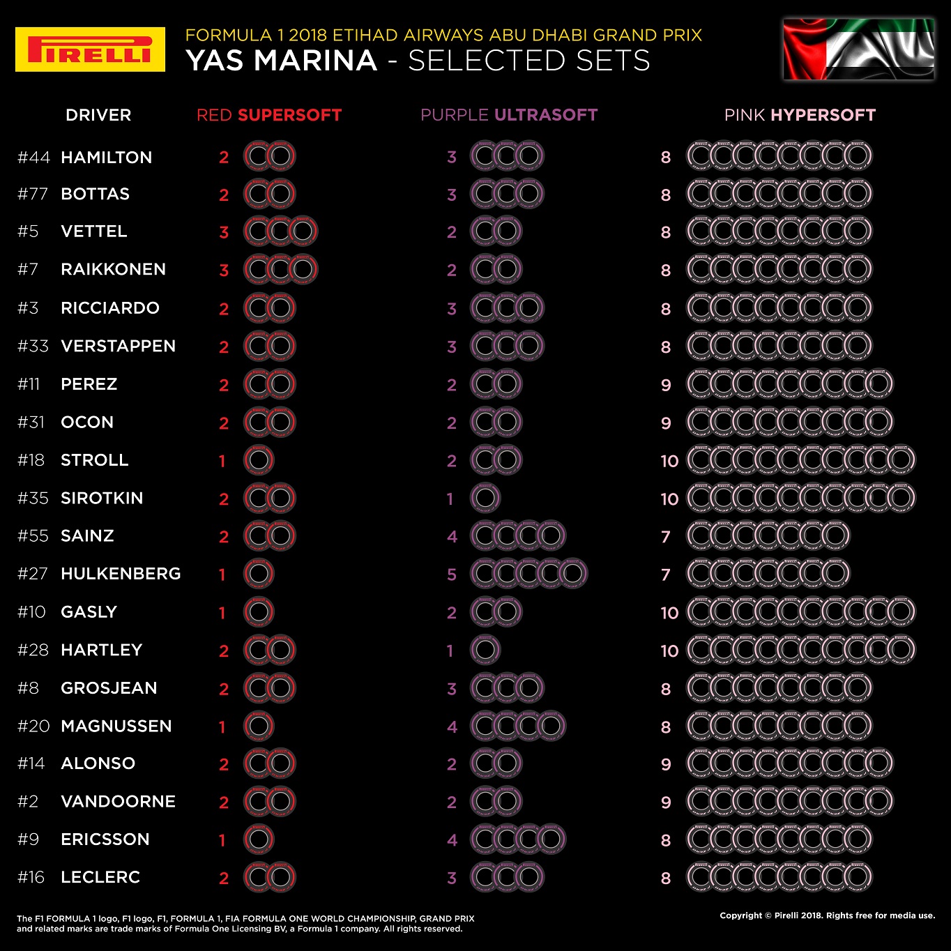 Milão, 13 de novembro de 2018 – A Federação Internacional de Automobilismo (FIA) informou à Pirelli as escolhas de pneus de cada equipe para o Grande Prêmio de Abu Dhabi, que será realizado entre os dias 23 a 25 de novembro de 2018.