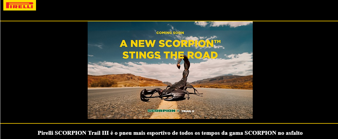 “A ideia de trazer o SCORPION Trail III para o mercado nacional se deu pela versatilidade deste pneu. Sabemos que o Brasil é um país com estradas com uma diversidade enorme de terrenos. Nesse contexto, o SCORPION Trail III traz alta performance no asfalto, mas possui também uma grande resistência à abrasão nos terrenos off-road”, disse Rutembergue Fonseca, diretor de Marketing de Pneus de Moto da Pirelli na América Latina.