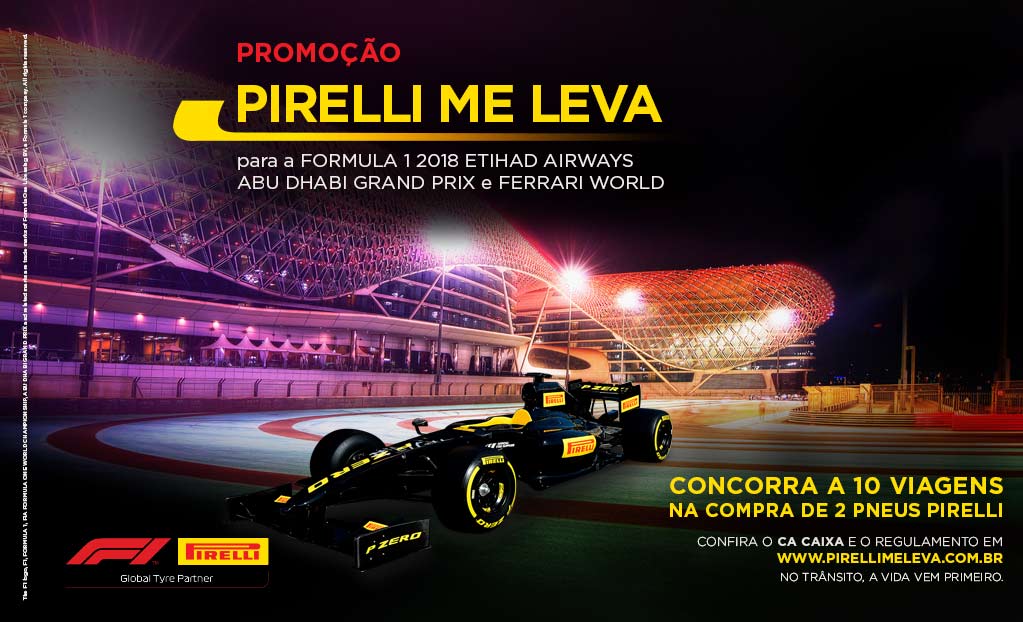 São Paulo, 16 de agosto de 2018 – A Pirelli lança nesta quinta-feira (16) a promoção “Pirelli Me Leva – Abu Dhabi e Ferrari World”. Na compra de dois pneus o cliente concorre a uma viagem para acompanhar o Grande Prêmio de Abu Dhabi da Fórmula 1. Além disso, poderá conhecer de perto o Ferrari World, parque temático da escuderia italiana que fica localizado ao lado do circuito de Yas Marina.