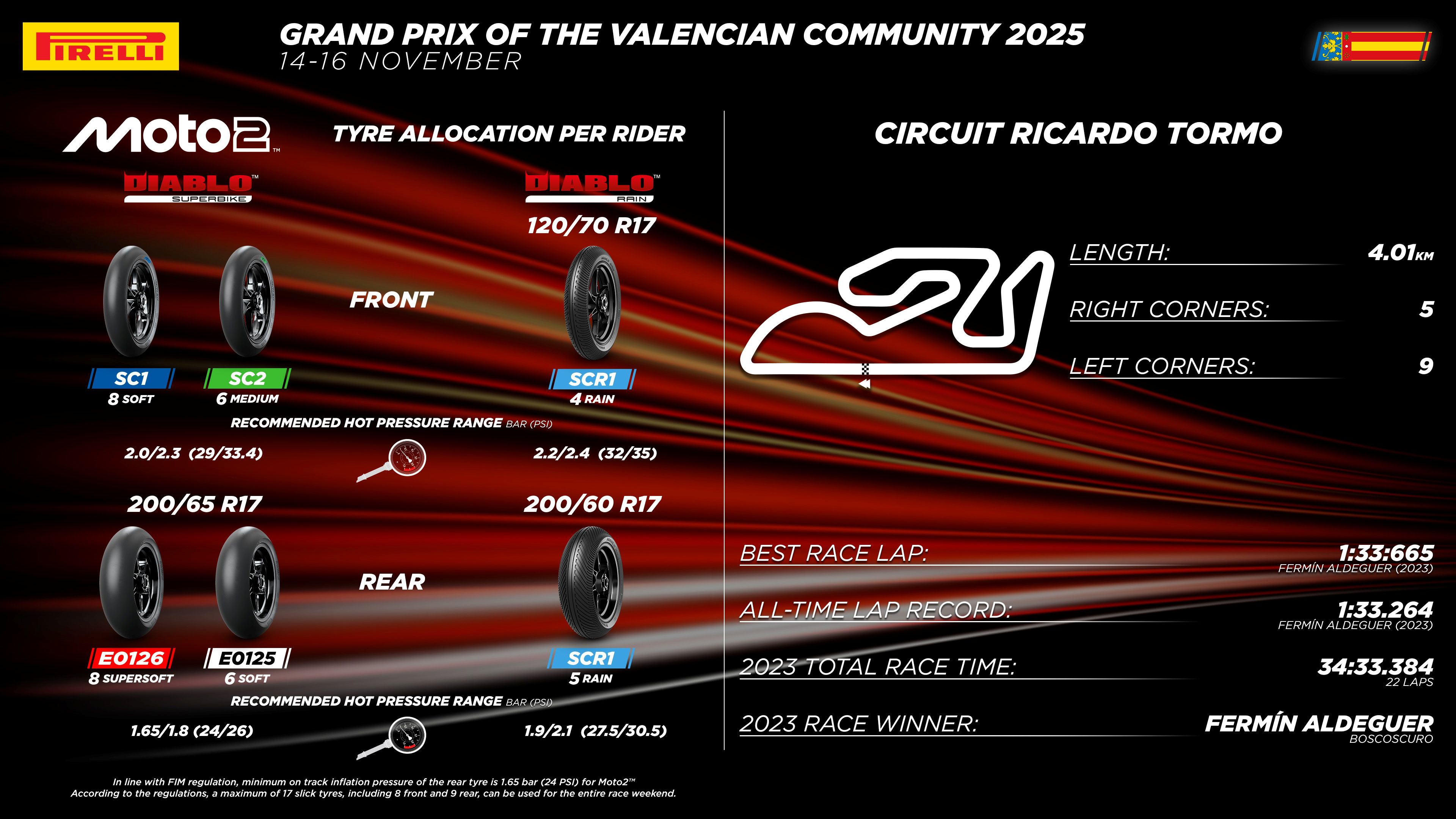 • O GP da Comunidade Valenciana é a última etapa do Campeonato Mundial de Motovelocidade de 2025 e, ao mesmo tempo, marca a estreia da Pirelli nesse circuito, já que a fabricante italiana de pneus nunca havia competido no Circuito Ricardo Tormo, em Valência, nas categorias Moto2 e Moto3. Para os pilotos da Moto2, retornam à cena o pneu traseiro supermacio na especificação E0126, que estreou no GP da Áustria, e o macio na especificação E0125, ambos amplamente apreciados e utilizados pelos pilotos da categoria intermediária. Trata-se de duas soluções de desenvolvimento que compartilham a mesma estrutura aplicada aos compostos de suas respectivas opções padrão. Os dois pneus traseiros podem ser combinados com duas opções dianteiras: o macio SC1 e o médio SC2, ambas soluções padrão.