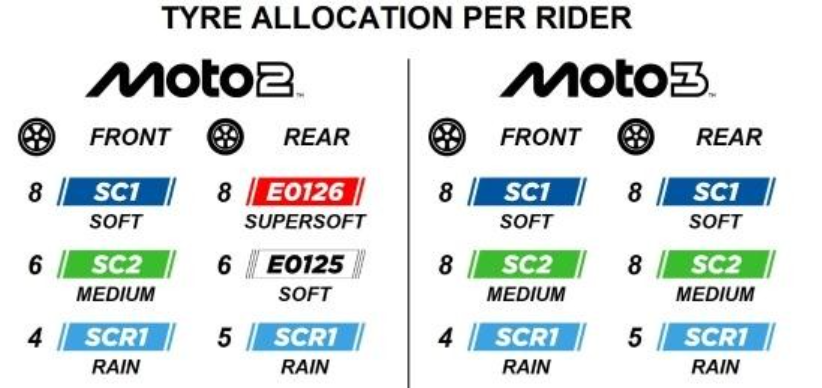 · Enquanto a Moto2 contará com duas soluções traseiras em desenvolvimento, na Moto3 os pilotos poderão confiar na alocação padrão composta pelos pneus macios SC1 e médios SC2 em ambos os eixos, que já demonstraram excelente performance ao longo da temporada.