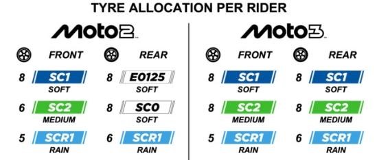 · A alocação para os pilotos da Moto3™ também não foi alterada em comparação com Silverstone: SC1 macio e SC2 médio, tanto para a dianteira quanto para a traseira, cada um disponível em 8 unidades por piloto. Mais uma vez, cada piloto poderá utilizar um máximo de 17 pneus durante o fim de semana.
