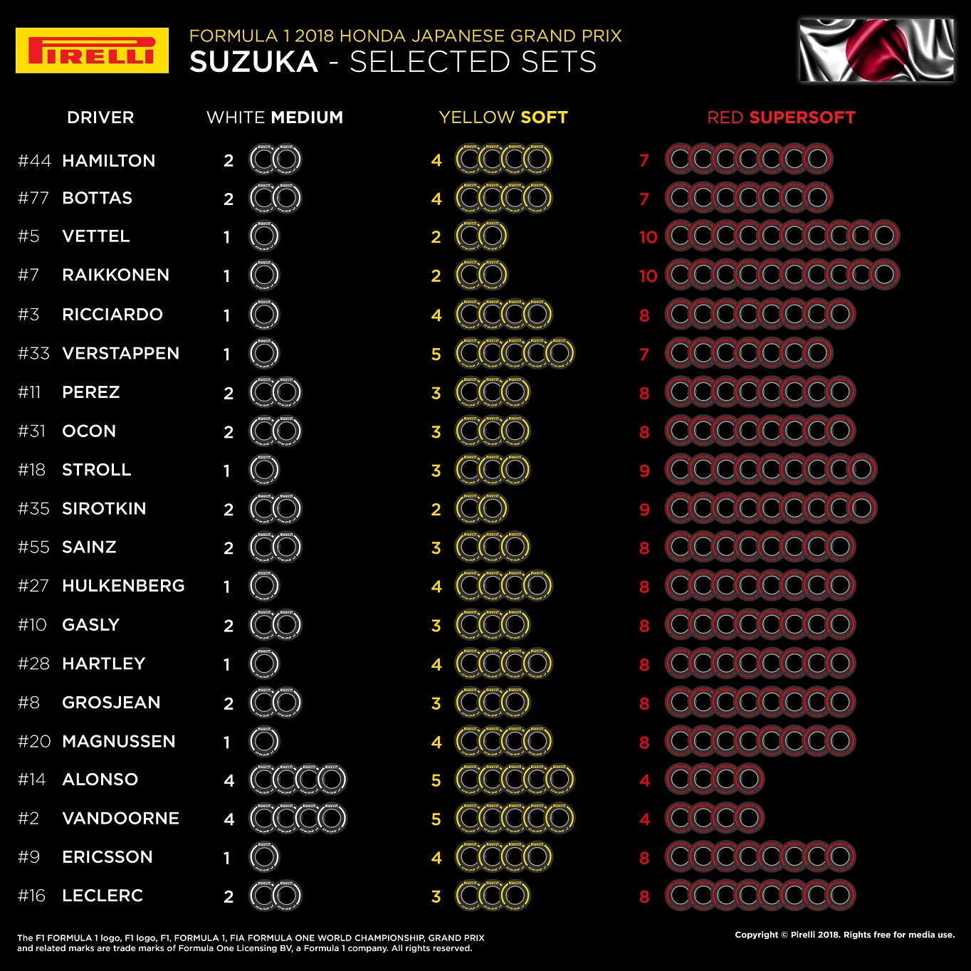 Milão, 25 de setembro de 2018 – A Federação Internacional de Automobilismo (FIA) informou à Pirelli as escolhas de pneus de cada equipe para o Grande Prêmio do Japão, que será realizado entre os dias cinco e sete de outubro de 2018.