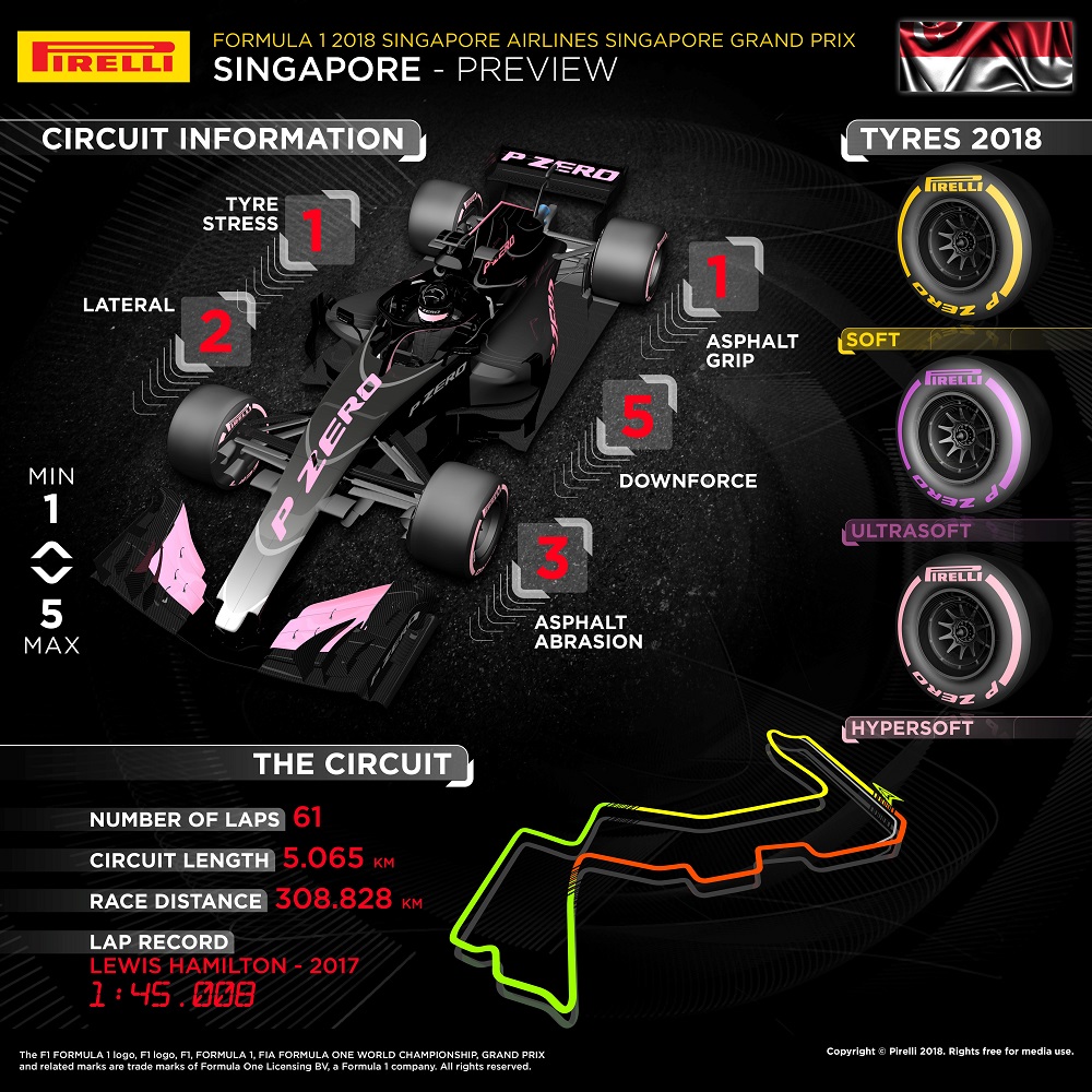 Mario Isola, gerente mundial de Motorsport da Pirelli: “Escolhemos o hipermacio para Singapura, o que deve abrir diferentes possibilidades de estratégias, dependendo dos pneus escolhidos por cada piloto. Ao colocarmos um ‘degrau’ entre as nomeações, esperamos ter intervalos de performance bem definidos entre os diferentes compostos. Há muitas estratégias possíveis, fora a possibilidade de safety car e outros elementos imprevisíveis típicos de um circuito de rua. Do nosso ponto de vista, apesar de a volta ser bem lenta, os pneus têm que lidar com altas temperaturas, umidade, muitas curvas e os desafios habituais de um circuito de rua, como a aderência variável. O fato da corrida ser noturna também adiciona variáveis adicionais para os cálculos.”