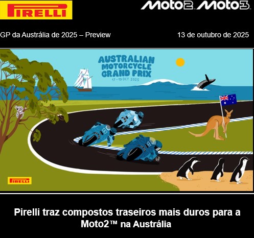 - Para o GP da Austrália de Motociclismo de 2025, em Phillip Island, um dos circuitos mais exigentes para os pneus em todo o calendário do Mundial, a Pirelli fornecerá aos pilotos de Moto2™ duas opções de pneus traseiros com compostos mais duros do que os normalmente utilizados. Essa escolha visa lidar com as particularidades do traçado australiano, que impõe grande estresse aos pneus, especialmente no lado esquerdo, e apresenta um asfalto que gera altos níveis de desgaste.