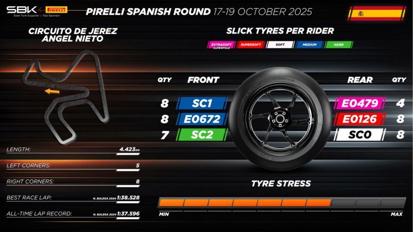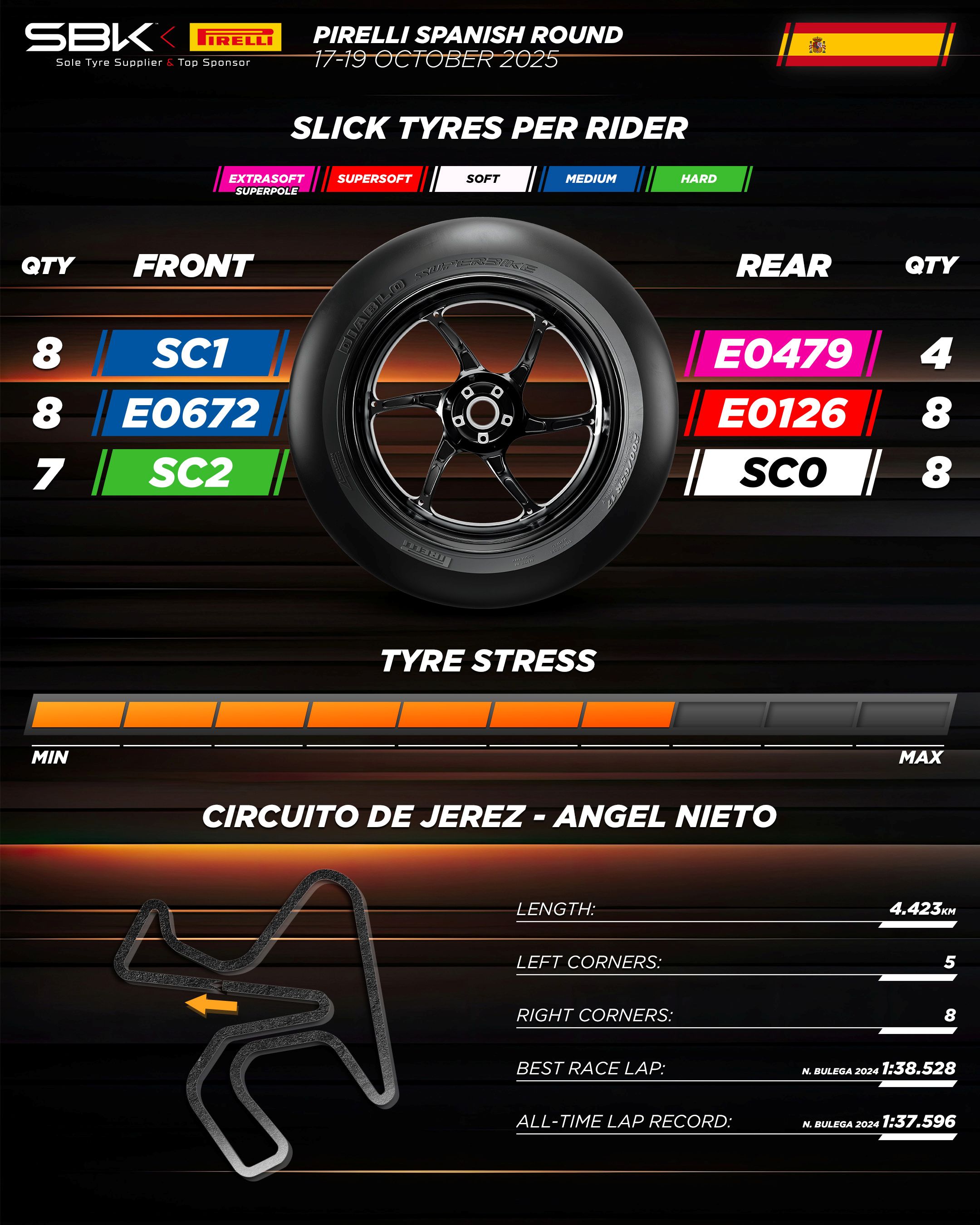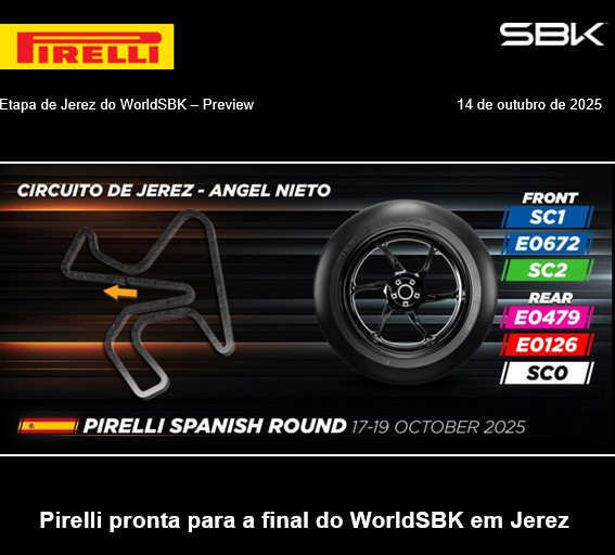 - Com a etapa espanhola, programada para os dias 17 a 19 de outubro no circuito de Jerez de la Frontera, o Campeonato Mundial de Superbike FIM 2025 chega ao fim e coroará o novo campeão mundial do WorldSBK. Para esta ocasião, a Pirelli apostará nas mesmas especificações introduzidas no fim de semana passado em Estoril, incluindo os novos pneus de desenvolvimento: dianteiro E0672 e traseiros E0126 e E0479.