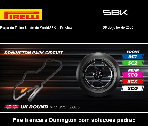 · Com a Etapa do Reino Unido agendada para este final de semana em Donington Park, o Campeonato Mundial de Superbike da FIM entra oficialmente em sua segunda metade da temporada. Para esta etapa, a Pirelli fornecerá aos pilotos do WorldSBK a alocação composta exclusivamente por soluções padrão. As opções de pneus slick serão o SC1 médio e o SC2 duro na dianteira, enquanto na traseira os pilotos poderão escolher entre o macio SC0 e o supermacio SCX além do extramacio SCQ disponível em quatro unidades e, como de costume, utilizável apenas nas sessões de treinos, classificação e Superpole Race. Cada piloto terá 8 unidades para a traseira e no SC2 para a dianteira, enquanto do SC1 serão 9 pneus disponíveis.