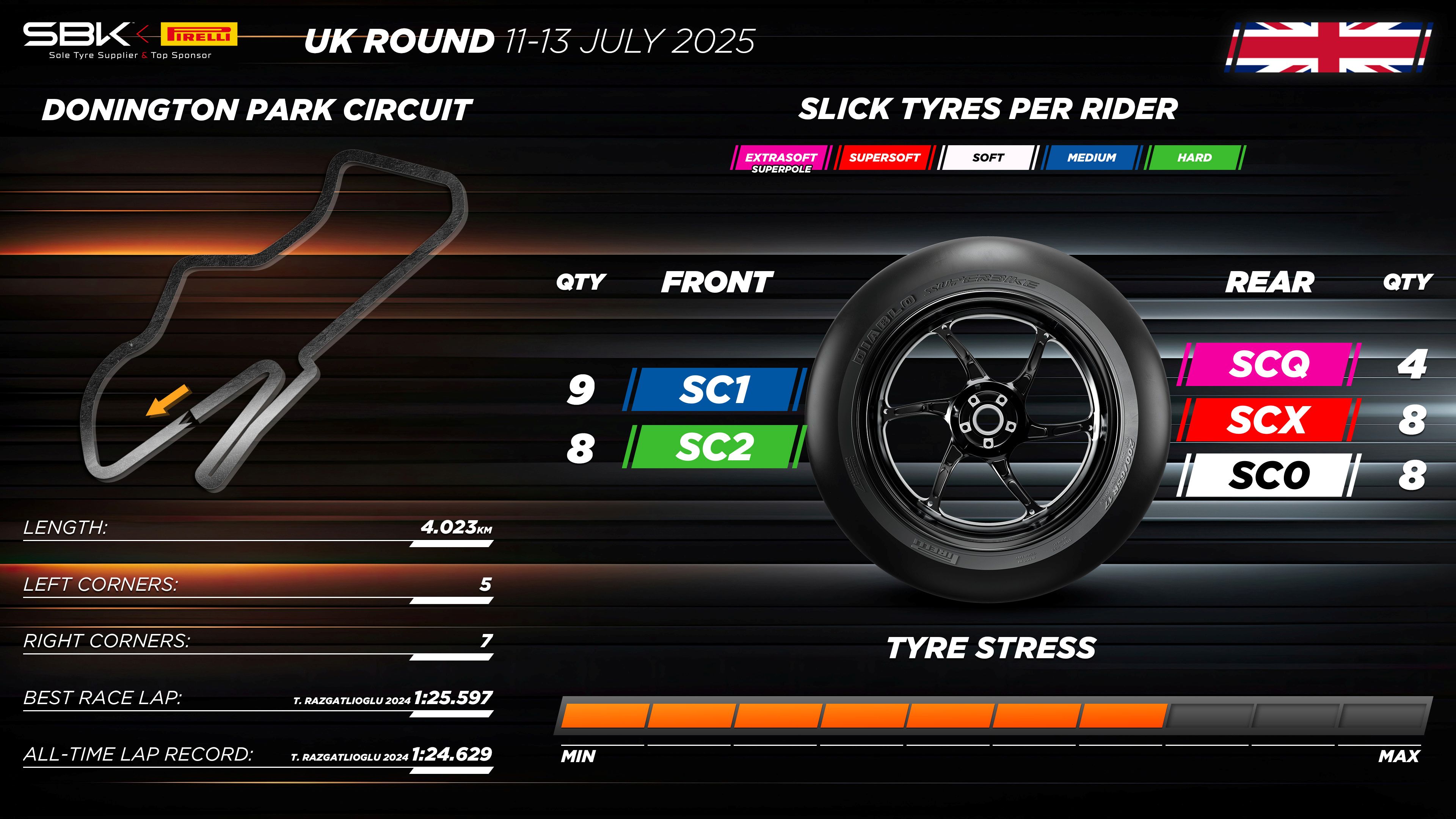 · Com a Etapa do Reino Unido agendada para este final de semana em Donington Park, o Campeonato Mundial de Superbike da FIM entra oficialmente em sua segunda metade da temporada. Para esta etapa, a Pirelli fornecerá aos pilotos do WorldSBK a alocação composta exclusivamente por soluções padrão. As opções de pneus slick serão o SC1 médio e o SC2 duro na dianteira, enquanto na traseira os pilotos poderão escolher entre o macio SC0 e o supermacio SCX além do extramacio SCQ disponível em quatro unidades e, como de costume, utilizável apenas nas sessões de treinos, classificação e Superpole Race. Cada piloto terá 8 unidades para a traseira e no SC2 para a dianteira, enquanto do SC1 serão 9 pneus disponíveis.