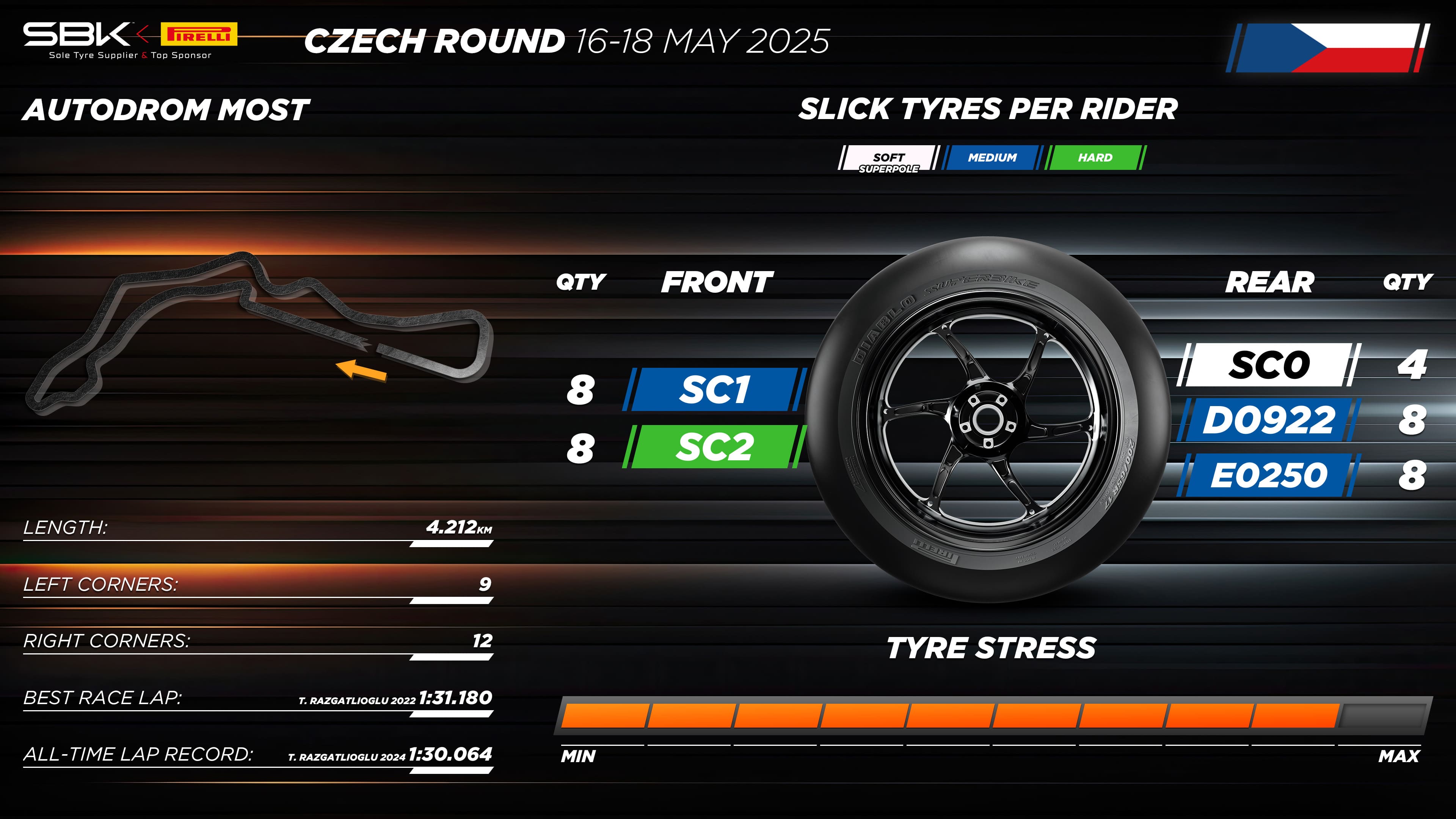 · Compostos médios no palco. Considerando as características do circuito, que é particularmente exigente para os pneus, os compostos médios são a escolha óbvia para Most. A especificação D0922, que estreou na Austrália com críticas positivas, tem estrutura e composto diferentes em comparação com o SC1 médio padrão, com o objetivo de oferecer uma performance mais consistente e maior estabilidade em intervalos de trabalho elevados. O médio na especificação E0250, que é completamente nova, utiliza o mesmo composto do D0922, mas tem uma estrutura diferente, com a intenção de aumentar ainda mais a estabilidade e a consistência da performance. Quanto aos dianteiros, as duas opções padrão, SC1 médio e SC2 duro, estão confirmadas.
