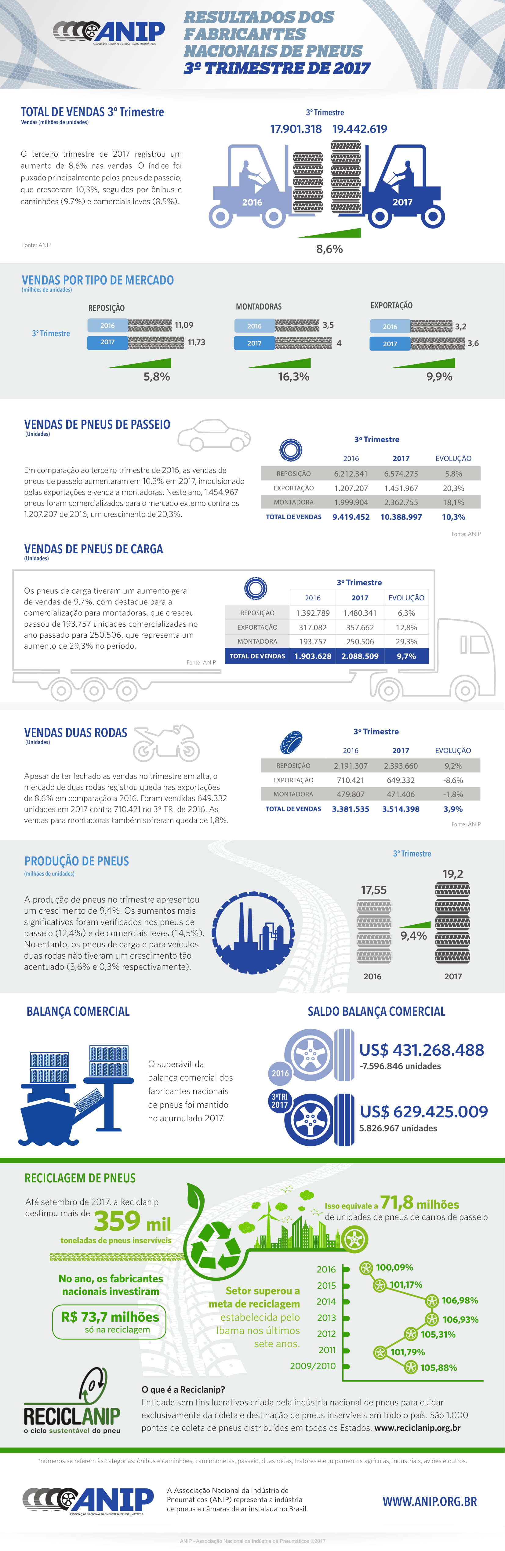 A Associação Nacional da Indústria de Pneumáticos (ANIP) divulga o balanço setorial de julho a setembro de 2016. O trimestre deste ano apresenta o mesmo cenário registrado há 6 anos, ou seja, o investimento feito no período pela indústria de mais de R$ 15 bilhões não foi recuperado. Em 2010, foram vendidas quase 19 milhões de unidades de pneus. Seis anos depois, a indústria registra a venda de cerca de 18 milhões de pneus.