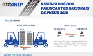 Segundo dados da Associação Nacional dos Fabricantes de Veículos Automotores (Anfavea), a retração observada no setor automotivo foi de 26,6% nas unidades negociadas em 2015, o que ocasionou uma queda expressiva nas vendas de pneus para as montadoras, levando à retração de 23,9% de unidades de pneus comercializados em 2015, fortemente impactada pelo fraco desempenho das vendas de pneus de passeio (-22,4%) e de carga (-49,6%). “O pneu de carga é um produto de alto valor agregado, cuja redução nas vendas impacta fortemente as receitas do setor”, avalia Alberto Mayer, Presidente da ANIP. O segmento de pneus de carga decresceu de 1,9 milhão de unidades vendidas em 2014 para 964 mil unidades em 2015.