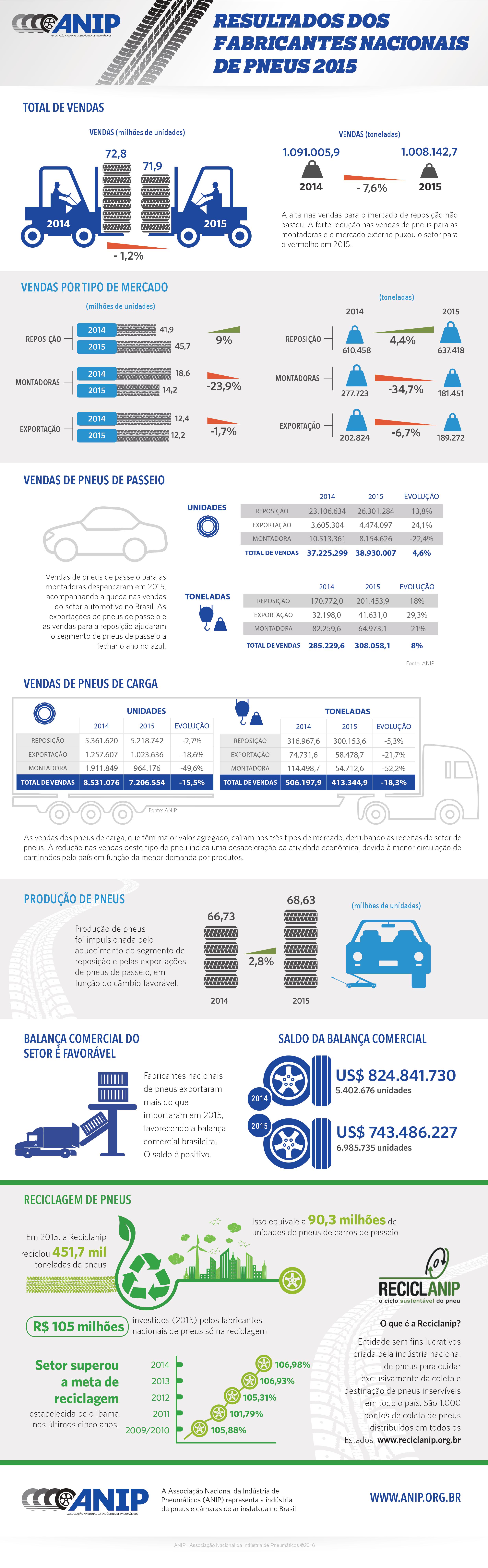 A Associação Nacional da Indústria de Pneumáticos (ANIP), que representa a indústria de pneus e câmaras de ar instalada no Brasil, divulga hoje o balanço setorial do ano de 2015.