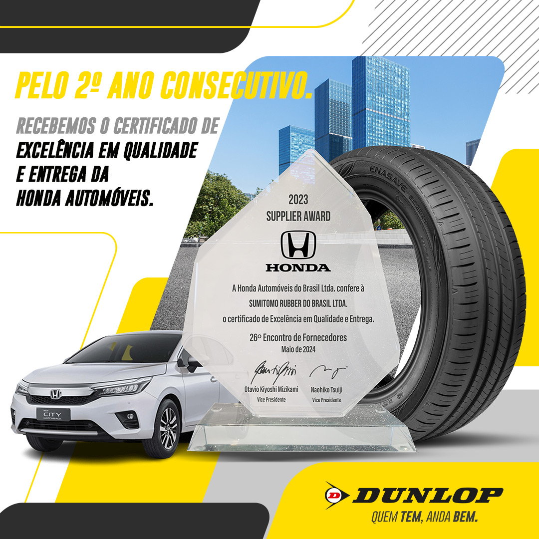 Detentora das marcas Dunlop, Sumitomo e Falken no país, a Sumitomo Rubber do Brasil foi premiada na categoria Excelência em Qualidade e Entrega, reforçando seu compromisso com a Honda Automóveis ao fornecer pneus de alta tecnologia.