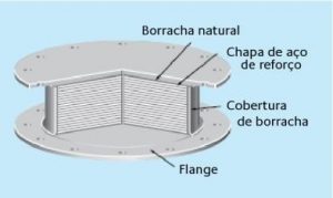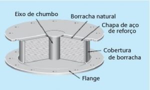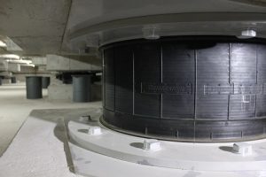 Os rolamentos de isolamento sísmico são suportes estruturais flexíveis que isolam a estrutura do edifício do chão para ajudar a reduzir a propagação do choque sísmico e a chance de danos caso ocorra um terremoto. O diâmetro desses rolamentos varia entre 60 cm e 1,80 m. As duas novas sedes, que devem ser concluídas em 2019, contam com uma estrutura de cobertura com isolamento sísmico*1. O fato de os rolamentos serem instalados sob a cobertura, em vez de embaixo da fundação do edifício, ajuda a diminuir a carga sobre os elementos de suporte estrutural da cobertura. Esse tipo de instalação é comumente utilizado em unidades com espaços grandes e abertos em forma de átrio ou domo, como arenas esportivas.