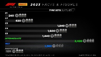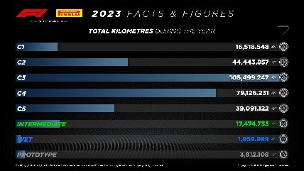 Ao todo, os pneus Pirelli de Fórmula 1 rodaram quase oito vezes ao redor da circunferência da Terra ao longo dos 22 GPs que compuseram a temporada de 2023. Especificamente, 307.925,8 quilômetros foram percorridos em 60.473 voltas pelos 6.847 jogos de pneus que foram guiados durante pelo menos uma volta por pilotos das 10 equipes que disputaram o Campeonato Mundial de Fórmula 1 deste ano.