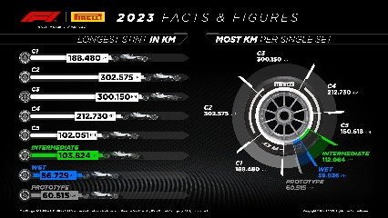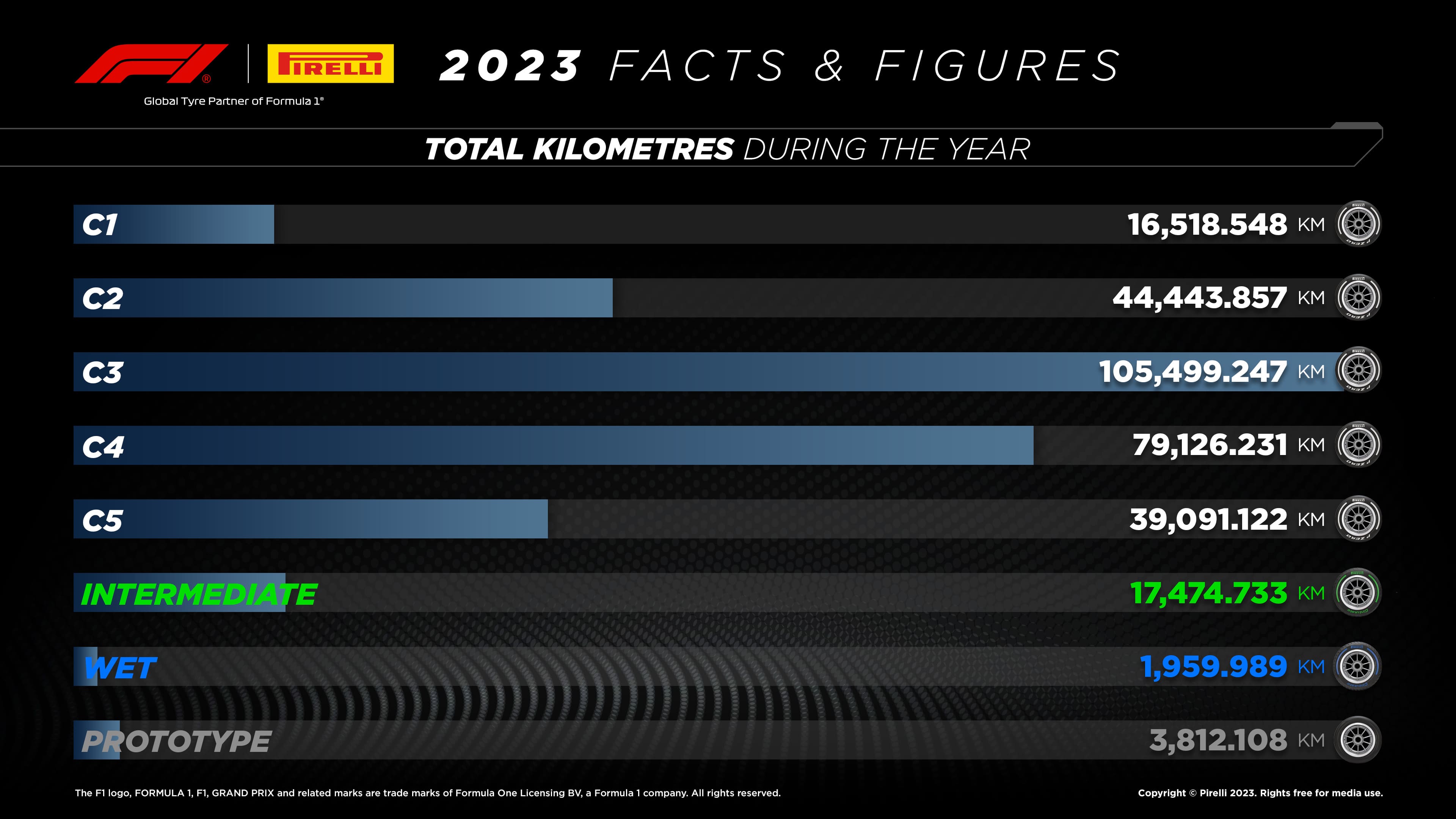 Ao todo, os pneus Pirelli de Fórmula 1 rodaram quase oito vezes ao redor da circunferência da Terra ao longo dos 22 GPs que compuseram a temporada de 2023. Especificamente, 307.925,8 quilômetros foram percorridos em 60.473 voltas pelos 6.847 jogos de pneus que foram guiados durante pelo menos uma volta por pilotos das 10 equipes que disputaram o Campeonato Mundial de Fórmula 1 deste ano.