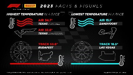 Austin provou ser a corrida mais quente do ano em termos de temperatura ambiente, com 34,7 graus centígrados no sábado durante a corrida Sprint e 32,8 graus durante o GP de domingo. Zandvoort foi o mais fresco, com temperatura média de 15,1 graus. Em termos de temperatura do asfalto, Hungaroring foi a corrida mais quente do ano com 53,6 graus, enquanto a mais fria foi Las Vegas com 18,5 graus.
