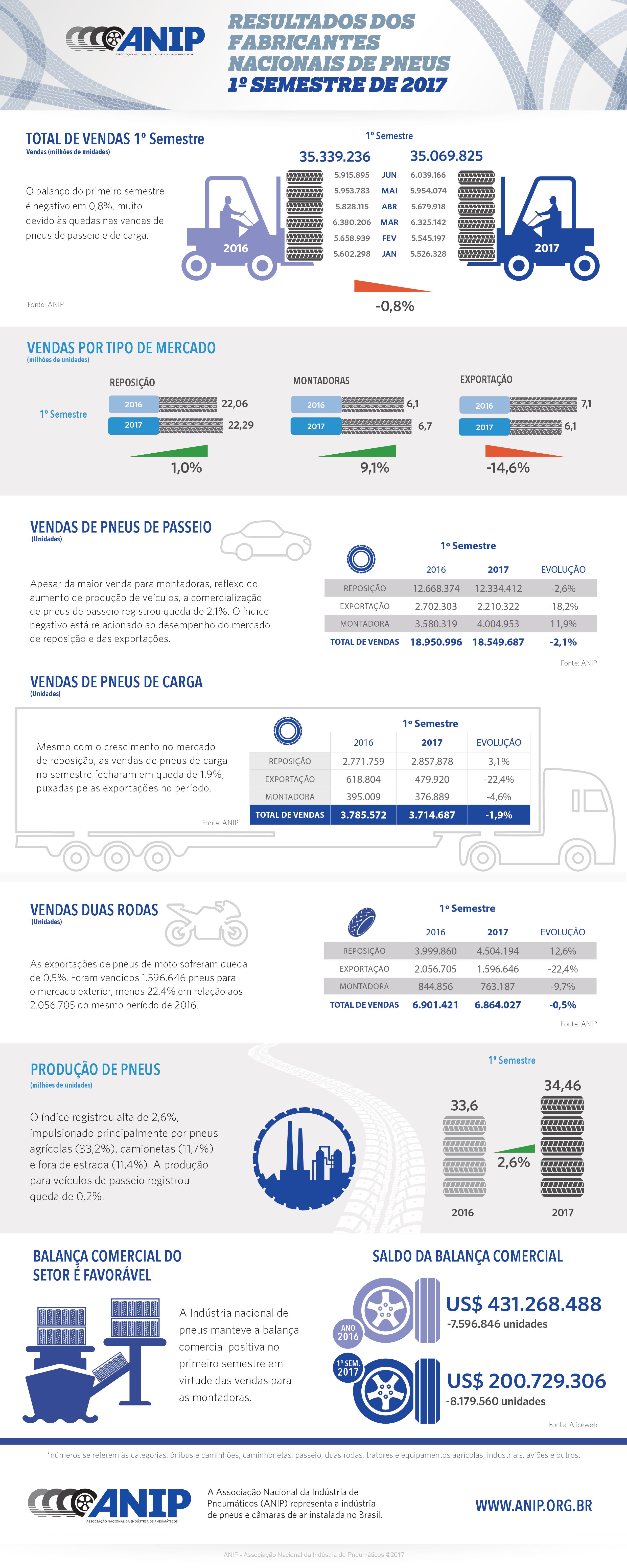 O semestre registrou um aumento de 2,6% na produção de pneus, com destaque para pneus agrícolas (33,2%), de camionetas (11,7%) e fora de estrada (11,4%). Já a produção para veículos de passeio apresentou queda de 0,2%. No total, foram produzidos 34.467.058 de pneus em 2017, contra os 33.603.113 no primeiro semestre de 2016.