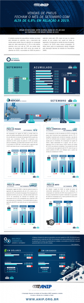 São Paulo, outubro de 2020 – A Associação Nacional da Indústria de Pneumáticos (ANIP) divulga o balanço dos dados setoriais referentes ao mês de setembro nesta sexta-feira (09).