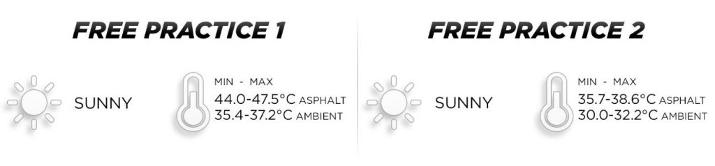 - As temperaturas da pista diminuíram rapidamente de 38,6°C para 35,7°C durante o segundo treino livre, que ocorreu quando o sol começou a se pôr. Essas condições foram bem diferentes do primeiro treino livre da tarde, em que as temperaturas da pista subiram até 47,5°C. Espera-se que as condições para a classificação no sábado sejam mais próximas das vistas no segundo treino livre, em vez da primeira sessão.